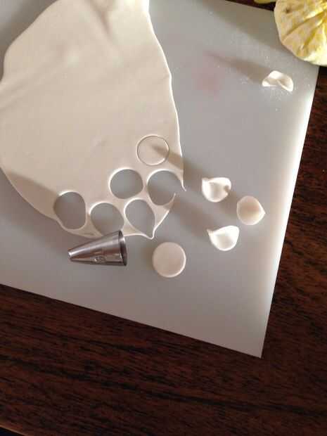 • Tomar su fondant blanco, estirar muy fina y utilice su cortador de círculos pequeños o la parte posterior de la punta de la tubería para cortar círculos pequeños.