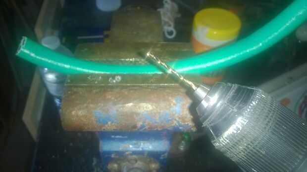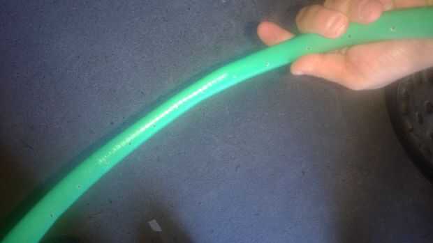 Luego preparo la entrada (pedazo de manguera de jardín normal ~ 30 cm de largo) por perforar pequeños agujeros a través de él en el espaciamiento de 3cm. Esto permite que líquido drenar y mantener el "túnel" claro del agua.