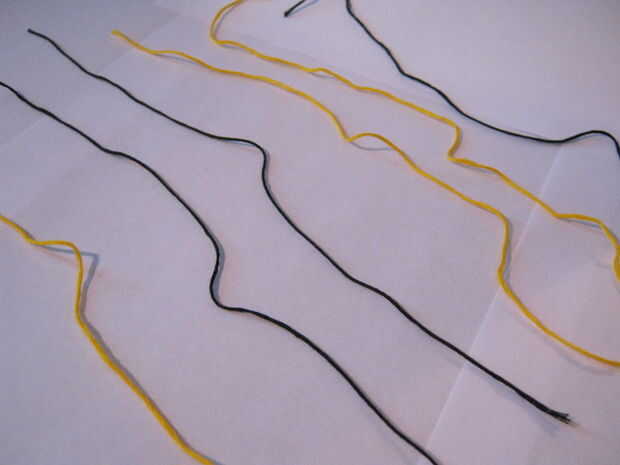 Para hacer una pulsera, medir cada cadena tres veces y media alrededor de su muñeca. Cuando tienes tres de ambos colores, Acomódalos como son en la foto. Atarlos juntos en la parte superior. Deje aproximadamente una pulgada para amarrar la pulsera.