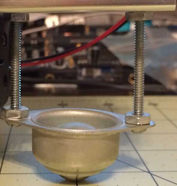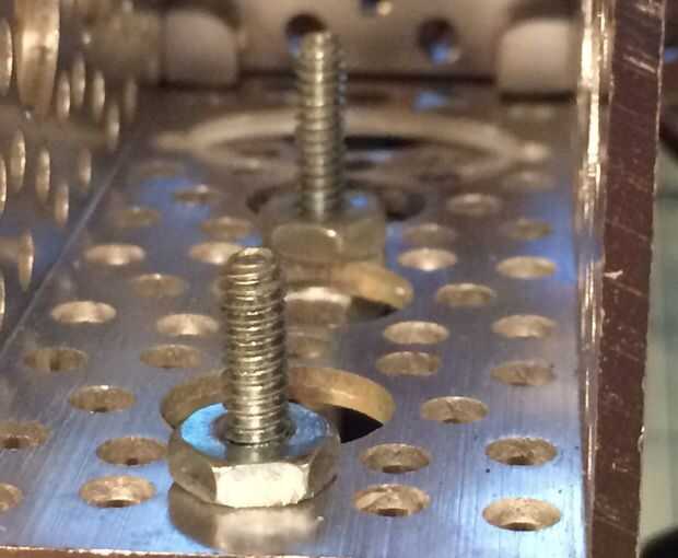 Toma el lanzador de bola de 5/8" 2 dos 6/32 2" pernos, seis 6 arandelas y tuercas de 6 seis. Coloque una arandela en el tornillo primero luego deslícela en el lanzador con la bola hacia abajo y el perno hacia arriba. Ahora coloque otra arandela en el tornillo luego una tuerca y rosca hasta el final del tornillo. Luego tomar la segunda (2) tuerca y rosca 1/4" entonces añada una arandela, coloque el tornillo en la parte inferior de la viga superior del chasis y añadir la última arandela y la tuerca. Apriete a mano solamente. Lo mismo para el segundo tornillo de la rueda y ajuste las tuercas en la parte superior y parte inferior para nivelar el chasis. Apriete todas las tuercas en el conjunto de ruedas ahora.