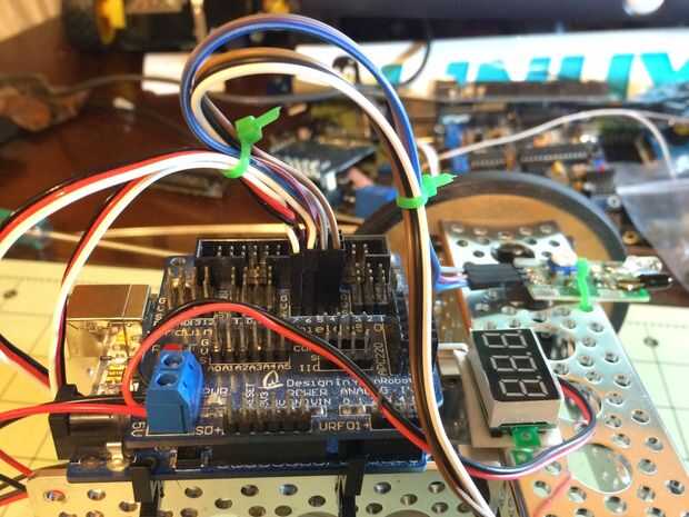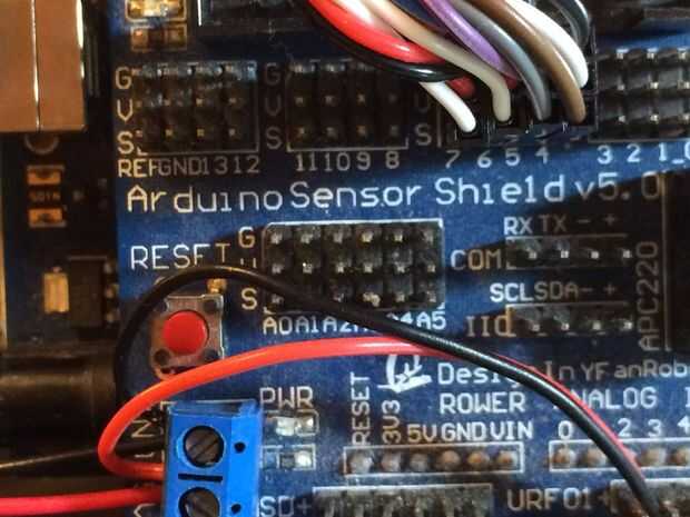 • Si usted decide utilizar un voltímetro para el bot, coloque el cable de tierra del medidor al cable de tierra del protector del sensor. Coloque el cable de posición (vcc) del medidor a VCC del escudo.