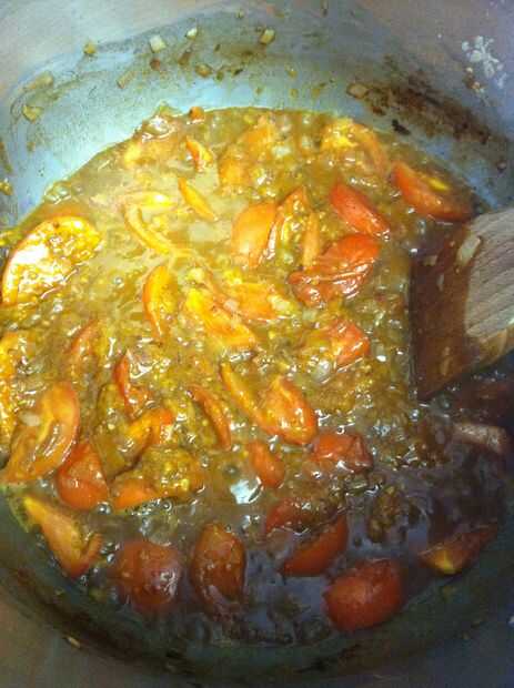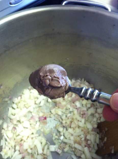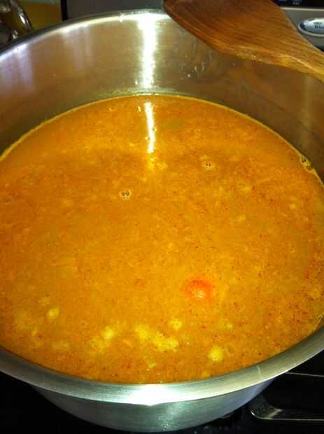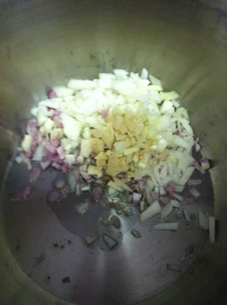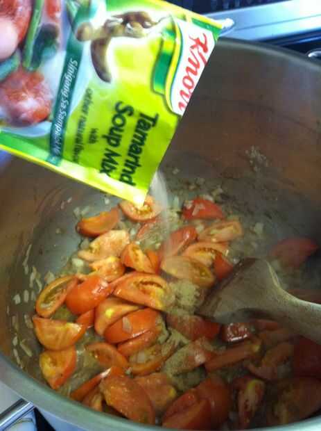 Añadir aceite de oliva en una olla grande a fuego alto.  Agregue cebollas y chalotes.  Añadir la pimienta blanca y sofría hasta que la cebolla comience a ser translúcido.  Añadir pasta de camarón y uno puede de cangrejo picada o gamba picada y seguir revolviendo hasta que la mezcla comience a hervir.  Agregue tomates y permitir que la mezcla a fuego lento durante 2-3 minutos.  Mientras tanto agregar caldo de pollo, salsa de Tamarindo caldo y pescado.  Añadir agua para subir bote a 2/3 completo y volver a alta temperatura.  Añadir el diakon demasiado en este punto.