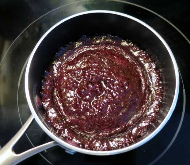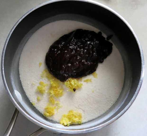 Proceso arandanos en la licuadora hasta que en su mayor parte suave, aproximadamente 1 minuto. Puré y limón ralladura de 1/4 de taza de transferencia a la cacerola con la mezcla de azúcar y mezcle bien todo. Mezcla de azúcar-arándano de calor sobre fuego medio hasta que a fuego lento, unos 3 minutos, revolviendo con frecuencia para disolver el azúcar y la pectina.