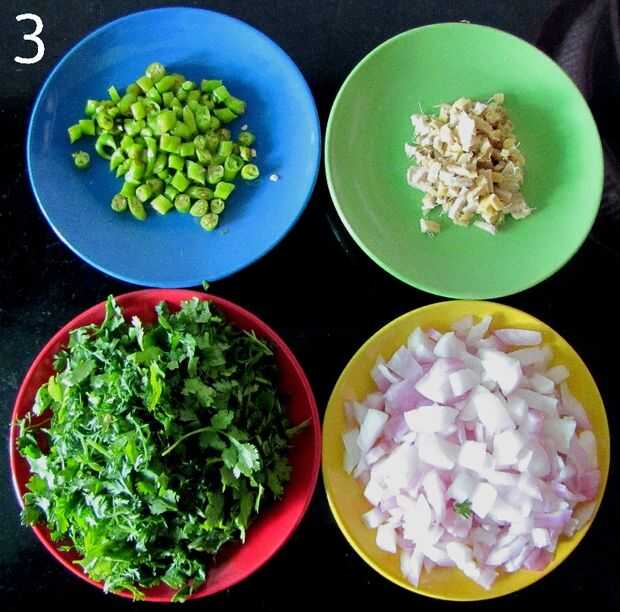 - Finalmente picar cebollas, chiles verdes (aproximadamente 6), raíz de jengibre y coriandro (Cilantro) (Ver imagen 3).