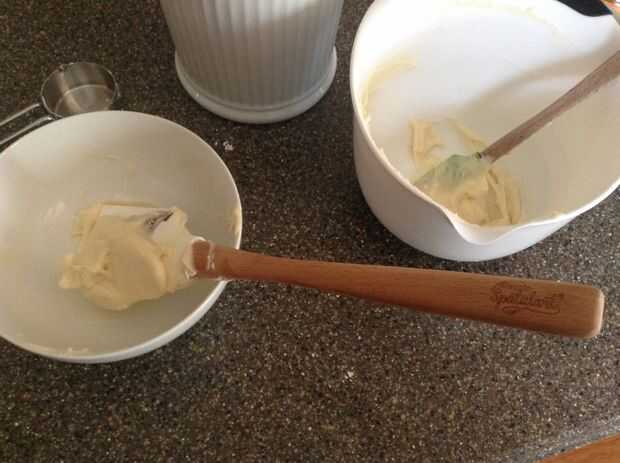 Tomar la mantequilla y batir con una espátula.