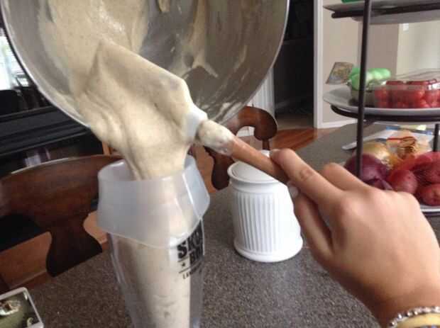 Poner una manga pastelera de silicona con una punta pequeña en una taza para mantener quieto al tubo.