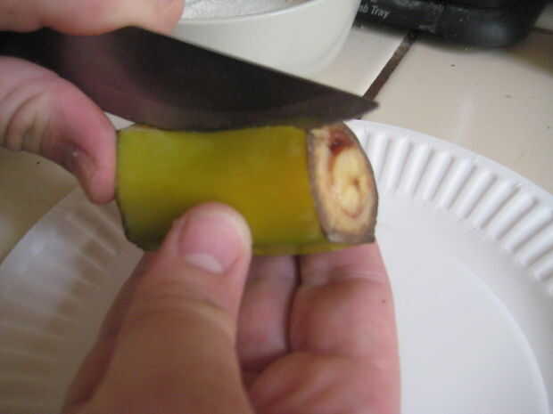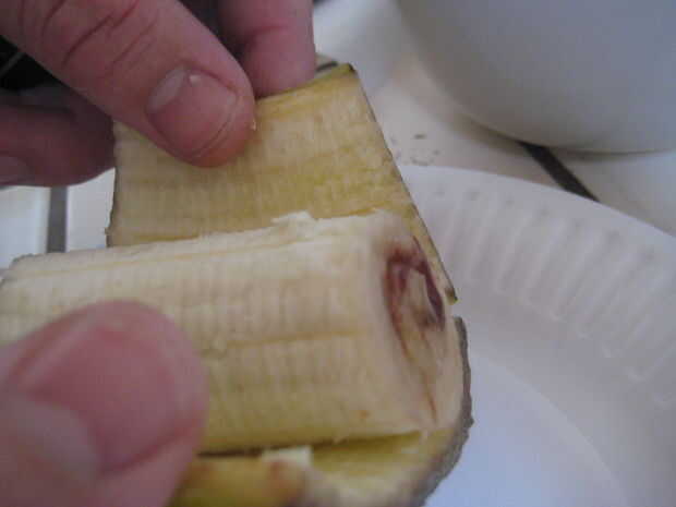 3. una vez que los plátanos estén congelados sólidos, cortar cuidadosamente la piel el lado, la tire suavemente de la piel