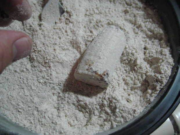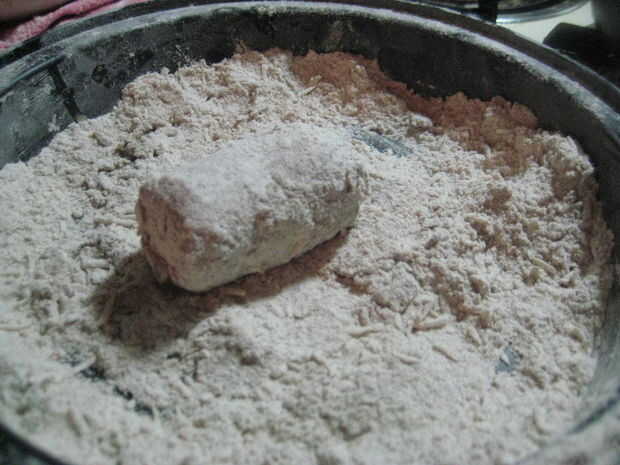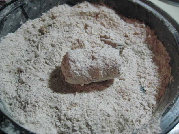 4. ligeramente la capa el plátano en la mezcla de harina.