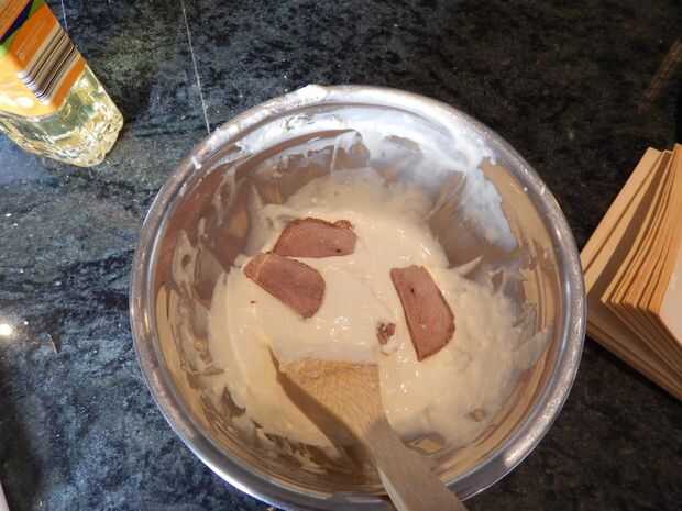 • Tiro la carne a la masa y revuelva sobre por lo que la carne es bastante uniformemente recubierta.