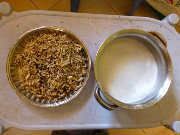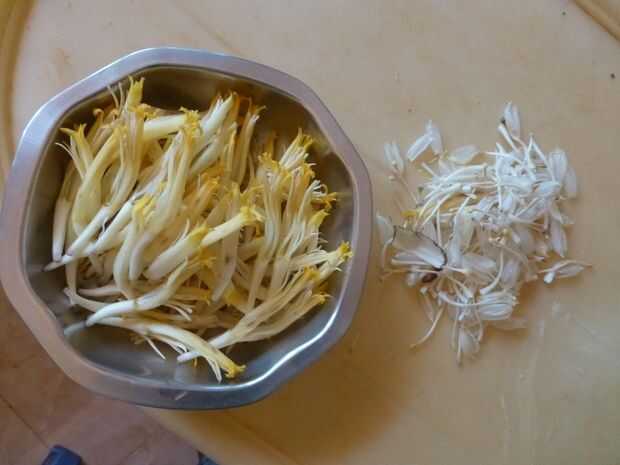 Después de quitar el plástico como pétalos y estambres duro, corte los floretes en pedazos pequeños y remójelas en agua mezclada con cuajada y sal durante unos cinco a diez minutos. Esto eliminará la decoloración de los floretes picados. Retire los flósculos empapados y drenar el agua.