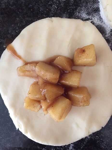 Usted debe poder conseguir 10 ~ 12 donuts. Vierta una cucharada de manzana en el centro de cada buñuelo aplanado. (No sobre cosas.) Junte los bordes y presione ellos como posibles.