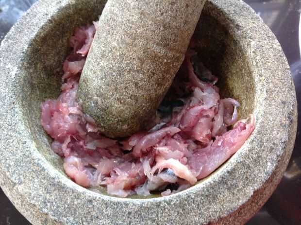 3. poner la carne en un procesador de alimentos y blitz para un 30seconds.if no tienes un processor.pestal de comida y mortero sería ok.the más bombardeo o pound.the más fina la carne le be.it es mejor para la mezcla tener múltiples texture.some de la carne de pescado son gruesas y algunos son más finos