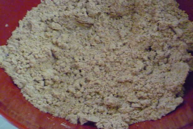 Utilizando una batidora de repostería mezclar la harina, la sal y el aceite de coco de manera uniforme.  Esto crea una mezcla que parece azúcar morena.