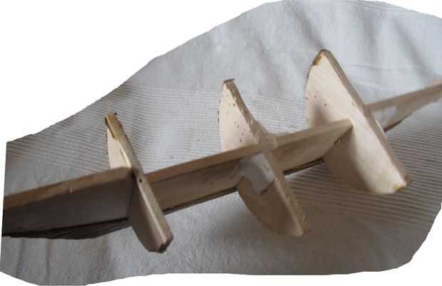 Seguimiento de los planes de la madera contrachapada o balsa y cortarlo. lo mismo para las costillas. no sé cuántas costillas desea utilizar intentan no muchos porque cuanto más utilizas el preciser la construcción tendrá que ser. Asegúrese de que cuando usted el espacio para la colocación de cortarlo tan exactamente posible otro sabio será flojo y causará asimétrica. Una vez que corta y coloca las costillas en la parte principal debe parecerse a la imagen y uso de fortificación adicional para las costillas se mantiene 90 grados a la parte principal cuando se trabaja en él. En principio no fortificar mina y tenía algunos problemas, así que asegúrese de que haces el camino correcto desde el principio.