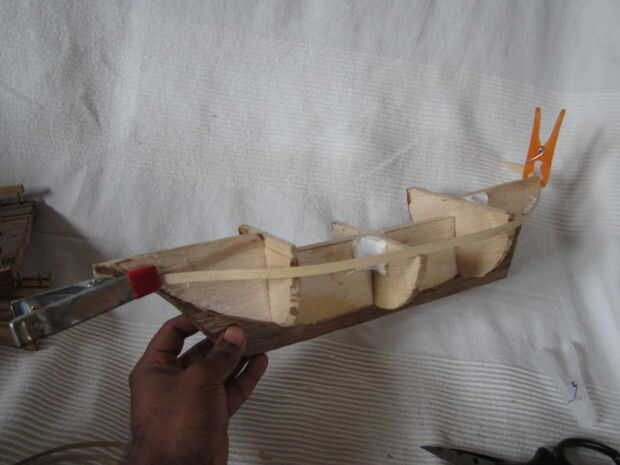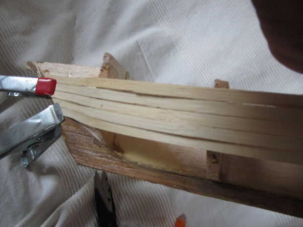 Después uso una pluma y dibujó la curva para el cuerpo, cortar la rota para que coincida con la curva y comenzó a pegar la rota va de arriba a abajo. Cuando las rayas no intentan ser demasiado codiciosos y pegado muchos a la vez, tomar 4 a 5 rayas y espere que se seque antes de pegar el resto. Durante este proceso habrá tiempos Cuándo hay gap, puede tratar de evitarlo, pero si no puedes no te preocupes que se puede llenar con epoxy, madera presentación o rayas más delgadas se corta al tamaño correcto. Y pinzas, abrazaderas o algunas otras cosas (ella también me los usas para ropa Fest en la línea seca) para mantener las rayas en su lugar mientras se seca. Ambos lados al mismo tiempo puede ser difícil pero acelerará la construcción. Cuando termine de utilizar barniz de madera para el toque final.