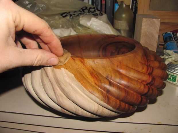 Aceite (5-6). Yo uso aceite Kunos. Con un trapo, aplica una capa gruesa. empapará. Me gustaría conseguir gotas bajan la arboleda y luego se extendió por la parte superior. Para la capa 2 y 3 aplique una capa más delgada. Saca el color muy bien. Entonces voy encima ligeramente con la cera de los ebanistas (abeja y mezcla de cera de carnauba) con lana de acero. Frótelo apagado con un paño limpio y listo :)