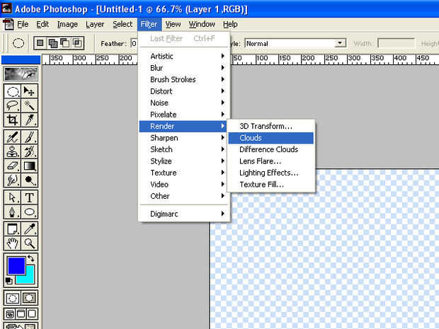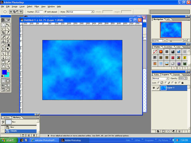 En primer lugar, escoge tus dos colores desea su burbuja también. Elegí un azul oscuro y claro. Luego ir a filtro > Render > Lens flare y utilizar la configuración predeterminada (me olvidé de hacerlo, esto hará que la burbuja parece brillante). Luego ir a filtro > Render > nubes.