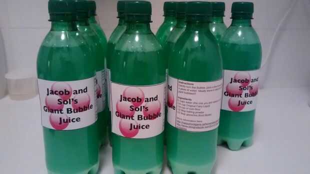 "Gire suavemente el jugo de la burbuja de un par de veces para mezclar (no agitar). Vierta en un recipiente y añadir un vaso de agua. Lo ideal sería dejar para reposar aproximadamente una hora y luego tener un ir en hacer algunas burbujas gigantes!