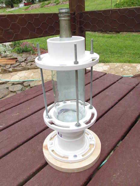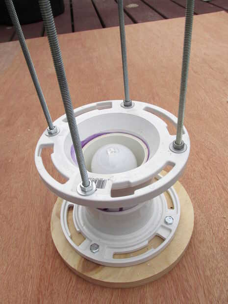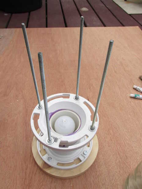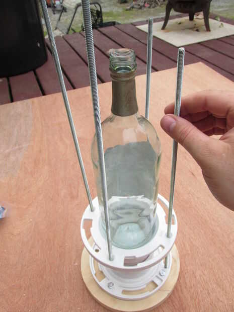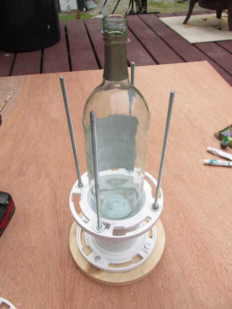 Usando una sierra para metales cortar la varilla roscada para que tengas 4 piezas que miden cada uno aproximadamente 9" de largo (esta longitud depende de la altura de la botella usas, 9 pulgadas debe dar su altura más que suficiente, pero si usted está usando una botella de vino inusualmente alta Asegúrese de compensar) Use arandelas y tuercas para asegurar las 4 piezas de varilla a la base de la lámpara como se muestra en la imagen. Estas barras de agregan a la mirada de la lámpara y sirven al propósito de sostener la botella de vino en su lugar sobre la base de la lámpara. Una vez tengas los cuatro vástagos roscados instalados, coloque la botella sobre la base de la lámpara y luego instalar la brida final de PVC como se muestra en la imagen.