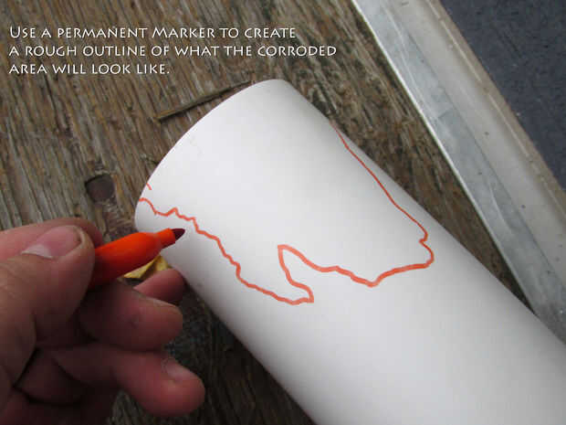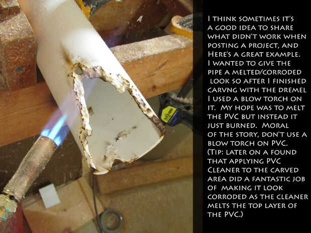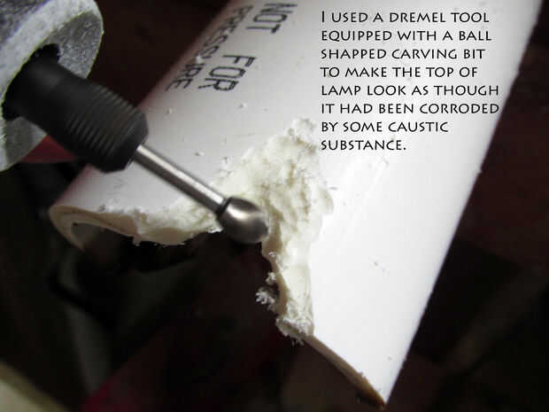 La parte superior de la lámpara está hecha de la sección restante del tubo de PVC de 3". Comience cortando la tubería a una longitud de aproximadamente 14", esto le dará suficiente espacio para esconder el cuello de la botella de vino, así como la bomba de aire de la caja de la burbuja que se instalarán más adelante. Para dar mi lámpara de carácter un poco y para que se vea como si lo había visto años de uso y corrosión lo hice un poco de tallar utilizando una Dremel equipada con una bola de punta broca de talla. Además he intentado derretir el PVC usando un soplete para aumentar el aspecto envejecido/corroído; Esto terminó siendo una mala idea, rápidamente descubrí que PVC no fundir, pero en cambio tiende a quemar, así que si quiere dar su lámpara un palo envejecido o corroído mira a tallar con una herramienta giratoria y tal vez aplique PVC un poco limpiador a tu talla final como el limpiador está diseñado para derretir un poco la superficie del PVC que es suficiente para dar la apariencia de una sección de corrosión de tubería.