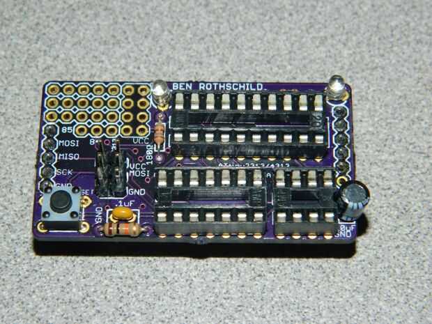 Lo que necesitaba era una forma de depurar el ATtiny chip sin constantemente la palanca de zócalos DIP (pobres piernas). Eso es cuando me golpeó: un ATTINY programación escudo!