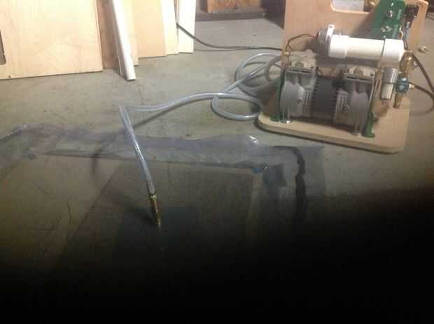3. la madera contrachapada se coloca en la bolsa de vacío y llevó a cabo bajo ~ 20 Hg de vacío hasta que el pegamento seque (unos 45 minutos para el pegamento que usé).