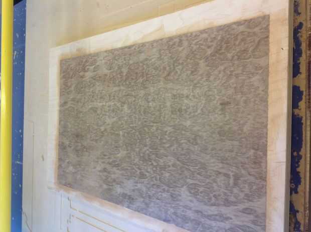 5. las carillas se lija planas y se agrega una sola capa de barniz. Esto minimiza el rasgue-hacia fuera al cortar las piezas en la fresadora.