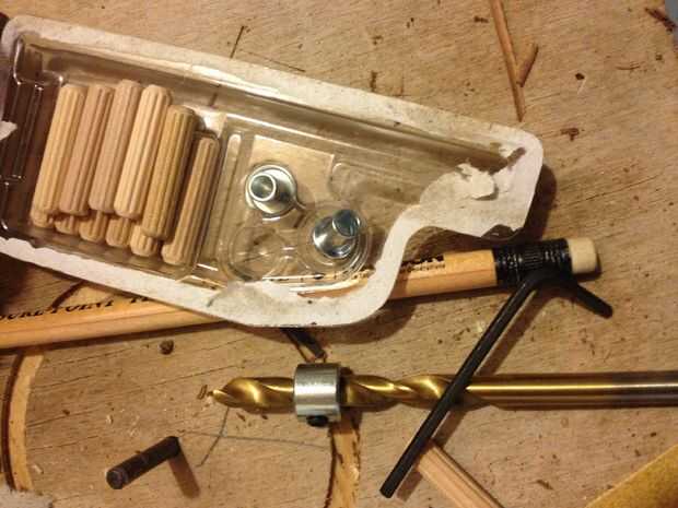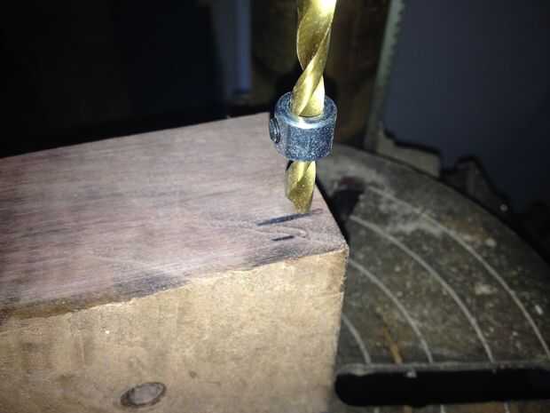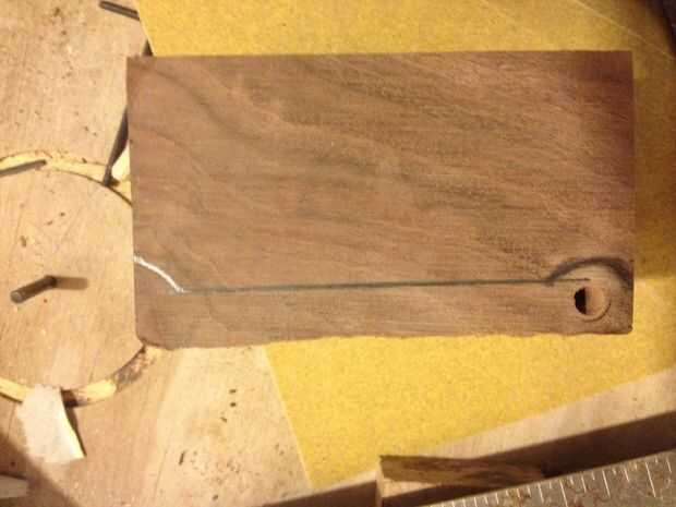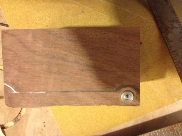Usé un 1/4" espiga de la bisagra. Marqué un centro para el agujero en el bloque de nuez 1/2" de la parte posterior y de la parte superior. Luego perforar un orificio 1/2" 1/4 de profundidad". Mediante un conjunto de pasador centros me alinearon las piezas de la caja y presionan los lados burl en los puntos para marcar donde los lados son para taladrar