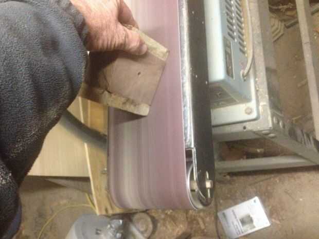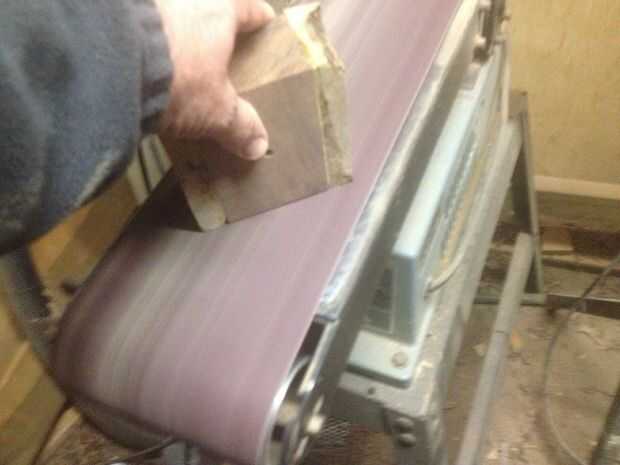 Lijar con una lijadora de banda de 6" con lija de grano 80 funciona bien, pero quita mucha madera rápido tan fácil que lo hace.