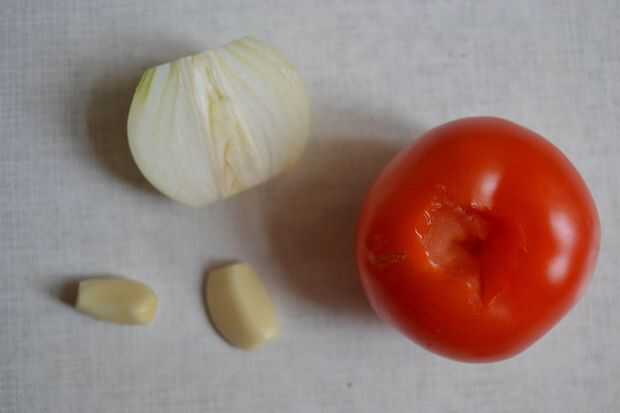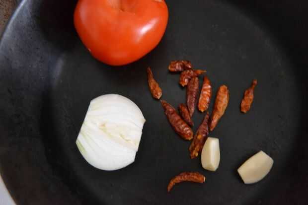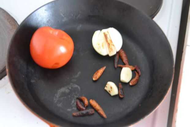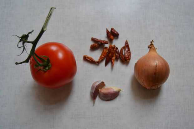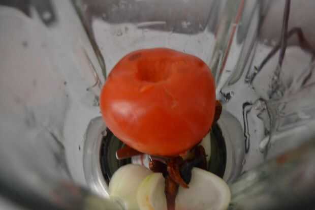 pelar la cebolla y el ajo y retirar el tallo del tomate. calentar una sartén sin mayores aceite y asar todos los ingredientes de todos los lados. Ponga todos los ingredientes en una licuadora y se mezclan en un puré suave. la cantidad de Chile que utilice determinará cómo "caliente" la salsa va a ser, a menudo pongo sólo algunos de los chiles, gusto y tal vez luego añaden algunas más
