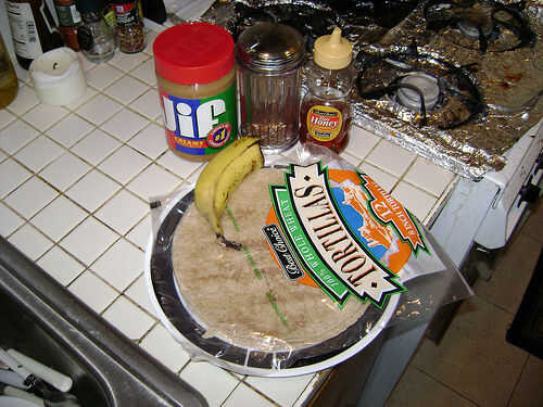 Paquetes de mantequilla de maní mucha azúcar pero también un montón de proteína, puede utilizar mantequillas de maní naturales o alternativas como mantequilla de almendras en el azúcar y los aceites hidrogenados. Uso integral envuelve para impulsar su ingesta diaria de grano y rociar la linaza para obtener una sacudida de ácidos grasos Omega-3. El plátano es una gran fuente de vitamina B6, vitamina C y potasio.