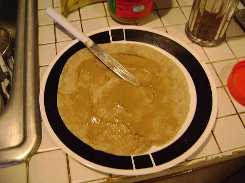 Establecer una franja de mantequilla de maní que cubre la envoltura entera, raspar una pequeña cantidad en un borde para usar como un pegamento para ayudar a mantener el abrigo cerrado. Colocar la banana en el centro y salsear la miel, por último espolvorear sobre la linaza.