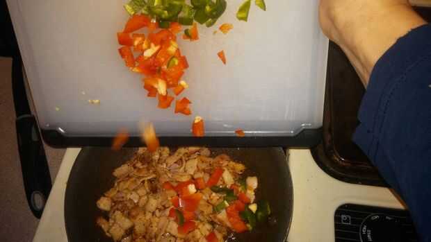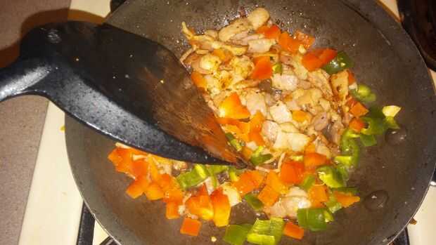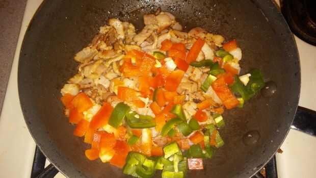 Mientras todavía se cocina el tocino, añadir los pimientos, esto suavizarlos y resaltar el sabor de los pimientos. Si te gustan crujientes, a cocinar los pimientos durante menos tiempo, mina cocino hasta que los pimientos a empezar a recibir suave.