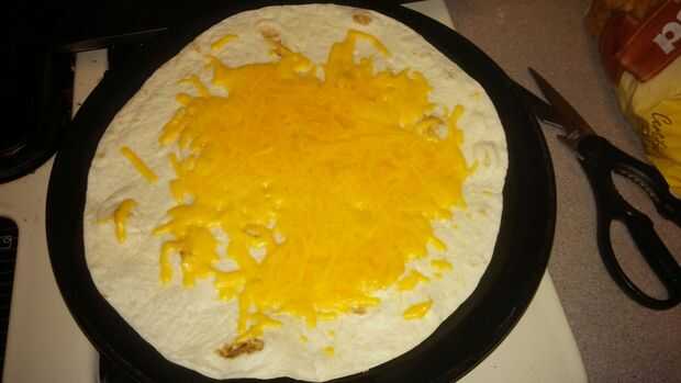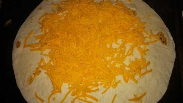 Ahora que la plancha es gratis, convertir calor a medio y coloque una tortilla en ella y difundir algunos cheddar rallado, en la parte superior, esperar hasta que queso se empieza a derretir, luego retire la tortilla del comal y colocar en una placa para el paso final.