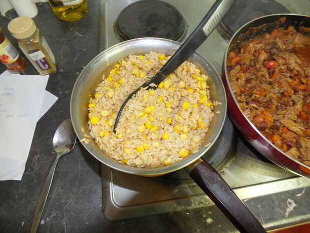 Cocer tu arroz hasta su casi listo y añadir el maíz, frijol negro, comino, pimentón, cilantro y jugo de limón.