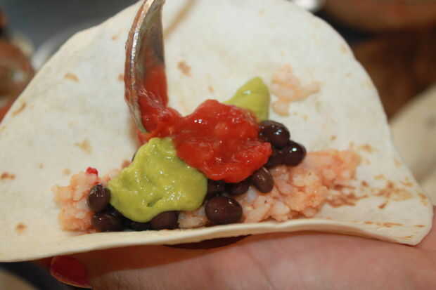 Para hacer un burrito tome una de las tortillas, agregar cucharada y media de arroz, una cucharada de té de guacamole, una cucharadita de la salsa, una cucharada de frijoles y queso para cubrirlo. Esto depende de si el tamaño de la tortilla. Si tienes los agradables y pequeña que deben ser mucho para rellenar la tortilla sin exceso cuando te retiras. Pero si tienes tortillas más grandes deberían añadir algunos más relleno.