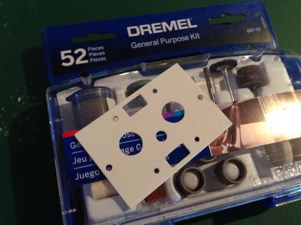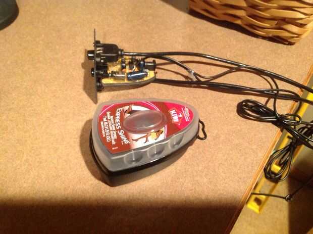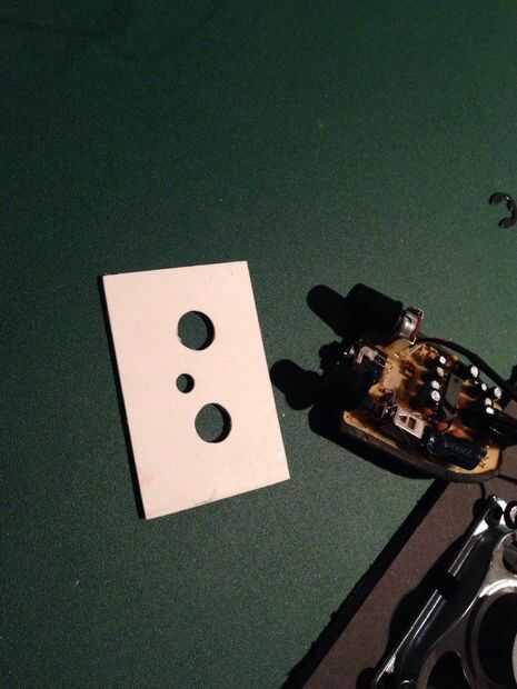 Problema solucionado, estilo "MacGyver" . Hicimos una placa para que coincida con los controles de altavoz y salida de auriculares de un desecho. Formamos dos agujeros rectangulares usando una herramienta giratoria, papel de lija y un tablero de emory. Se realizaron búsquedas en la casa buscando una caja albergar y mantener todo en su lugar. Con un poco de corte, la parte inferior de un contenedor de pulimento del zapato era una combinación perfecta. Usando una tira de metal aislado con caucho de encontrar en una tienda de chatarra, las piezas de la abrazadera juntas a ambos lados de la arcada.