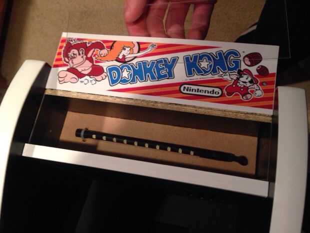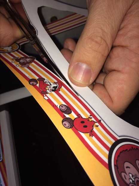 Con la ayuda de Photoshop, mi hijo ajusta tamaño y el resto de la obra de arte. Se impreso el arte de lado y marco de ventana de arcade en el papel de la etiqueta de hoja completa.