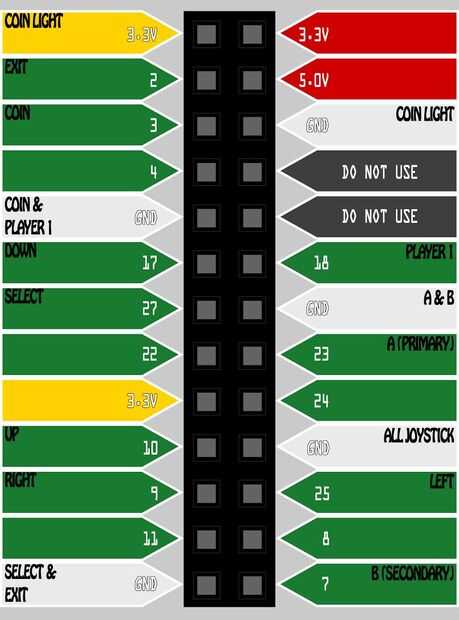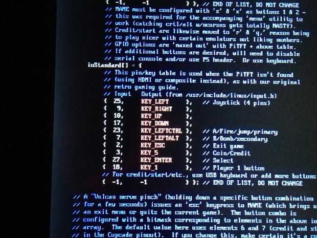 7. por último, estábamos dispuestos a comprar todo lo de los botones y controles de arcade. Deliberadamente optamos por utilizar a los controles arcade tamaño completo para intentar mantener el arcade tan familiar como sea posible a los clásicos. Compramos todo que lo necesario desde Groovy Game Gear. Para conectar los controles, instalado Retrogame en la Pi y seguido las instrucciones aquí. Tenga en cuenta que en las instrucciones pueden ir con los valores predeterminados o personalizar los controles. Por defecto sólo tiene control direccional y el botón al botón B. Modificado para requisitos particulares la tabla de clave o pin en el archivo retrogame.c para agregar "Esc" "seleccionar" "Moneda" y "jugador 1" a la lista predeterminada. Haciendo esto, eliminamos la necesidad de utilizar un teclado completo para cualquier función necesaria. La foto 4 muestra cómo hemos modificado para requisitos particulares archivo de configuración de Retrogame. Si te gusta, cuando llegas a ese paso en las instrucciones, edite el texto en el archivo de retrogame.c nuestro y guardar. Así que no tienes que leer mi escritura a mano, preparamos nuestro propio diagrama limpio en la 5ª foto que muestra cómo conectamos nuestros controles a los pines GPIO (es importante que sigas esto si va a modificar el archivo retrogame.c de la misma manera que hicimos: en otras palabras, son un juego).