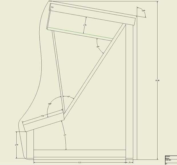 Nuestro modelo arcade logra exactamente lo que queríamos. Ver delante de nosotros a escala (en vez de visualizar nuestro modelo 3D en el ordenador) nos convenció que todo tenía que ser 3/4" para dar un poco más espacio para nuestras manos. Así que todas las piezas rectangulares (es decir la parte de atrás del panel, la parte inferior, la parte superior, el bisel, etc.) pasó de ser 7" originalmente a 7 3/4". Además, hemos reducido el ángulo del panel de control para hacer más cómoda y además ajustar la línea de visión a la pantalla.