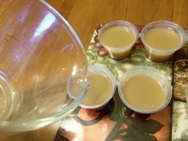 Una vez que haya terminado de mezclar todos sus líquidos empiezan a verter en los vasos de chupito o jello shot tazas de inmediato y luego pegarlas en el refrigerador inmediatamente! Debe dejar que estos chicos a sentarse allí por unos 2-3 horas antes de que se conviertan en gelatina.
