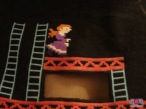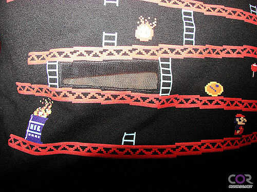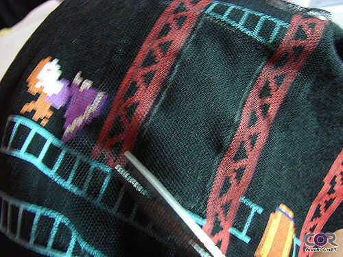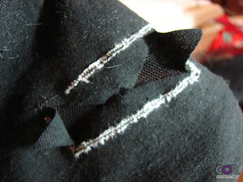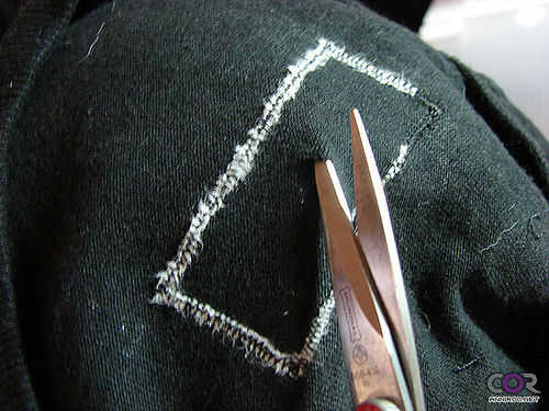 Con este pequeño hueco, corté una X hacia a las esquinas del rectángulo. Recorta la parte sobrante la tela de la camiseta cerca de las puntadas pero teniendo cuidado de no cortar las puntadas.