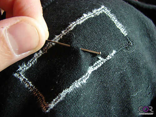 Para asegurarse de que no accidentalmente corte la malla de red utiliza un alfiler para levantar el tejido de la camiseta fuera y lejos de la malla y cortada un poco.