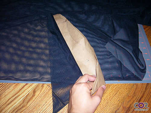 Mantiene control para asegurarse de que todo encaja, al principio no pero fija y finalmente tuvo un patrón de papel para cortar a la tela red malla de difícil de conseguir. Coloca el patrón de papel en el doblez de la tela, grano Cruz para que la orilla puede actuar como un ribete acabado en la muñeca.