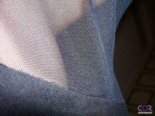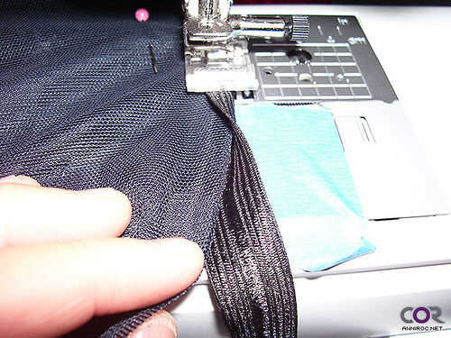 No me gusta crudos bordes usé elástico negro plegable para hacer una buena costura en la malla de tejido de punto.