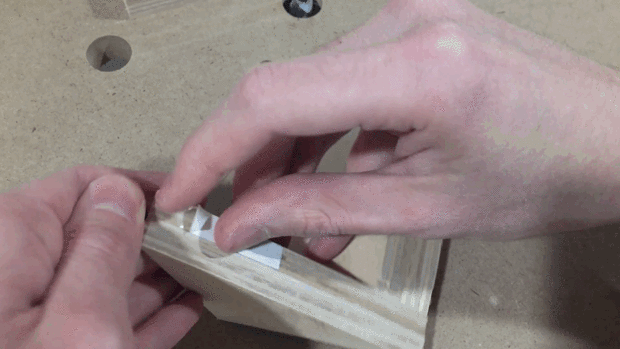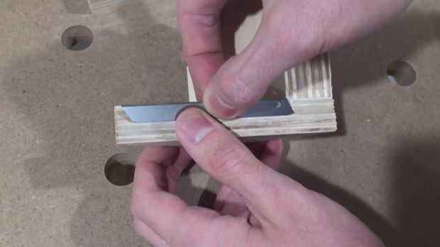 Se cortan ranuras poco profundas en la mesa de fresadora. Esto crea una ranura que proporcionan espacio para la lámina de cuchillo de utilidad. Las dos mitades que se pegan... pero de medida adicional, la hoja del cuchillo se lleva a cabo con unas tiras de cinta de doble cara.