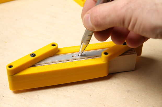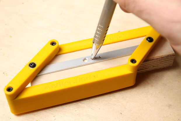 Su una herramienta práctica marca el centro de una pieza de trabajo, colocar las dos piernas alrededor de su pieza y marcar una línea o un punto o trace una línea con un canal de la pluma uno de los agujeros en la barra del medio. Debido al paralelogramo, el centro siempre se encuentra automáticamente.