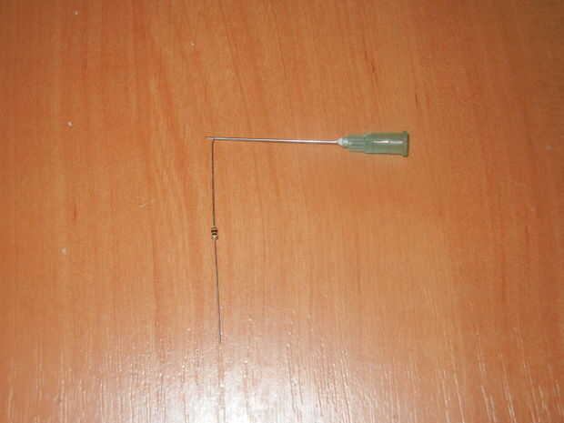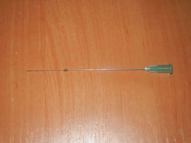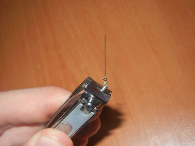 En segundo lugar. Cuando desea soldar el LED y su resistencia, tienes que trabajar en un espacio apretado bien (para hacer el dispositivo utilizable en la vida diaria, tenía que eludirlo. así que.. .aunque mi novia intentó sus agujas en mí con un modelo anterior voluminoso, tuve una idea. Enrolle un extremo de la resistencia alrededor de la aguja ¿, tirón puso y luego la soldadura alrededor de la LED? (la parte de soldadura viene después de poner el LED en el cuerpo impreso 3d)