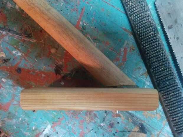 Una vez que el mango y la cabeza encajan muy bien o muy bien bastante una vez atornilladas no habría ninguna diferencia entre las 2 piezas... Taladré un agujero en el mango para no dividir cuando el tornillo iba a través de él y entonces había atornillado lo directamente en la pieza de madera sin un agujero previamente perforado para que pudiera sostener más.