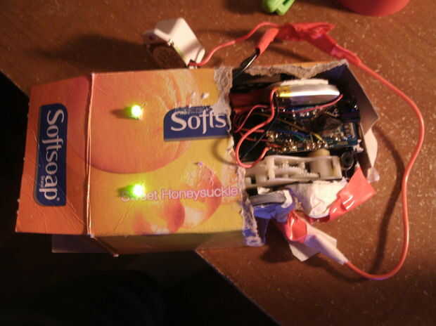 Ahora que todos los cables se configuran, se puede ir en búsqueda de un caso. (Antes de instalar el caso, asegúrese de cuando se junten los dos cables rojos que la alarma sonora. Si el zumbador no suena, entonces vuelva a conectar los cables a la batería y asegúrese de que todos los cables están tocando!) Usé un recipiente de jabón para este caso. Puesto que mucho del material eran tan grande, que tuve que cortar la mitad de este cuadro por lo que todo podría deslizarse fácilmente. (Si tiene mi coche, habrá llevado de. Puede hacer dos agujeros en la parte superior de la caja para que el LED puede pegarse hacia fuera. Cuando el LED se enciende, usted sabrá que su localización es en.)